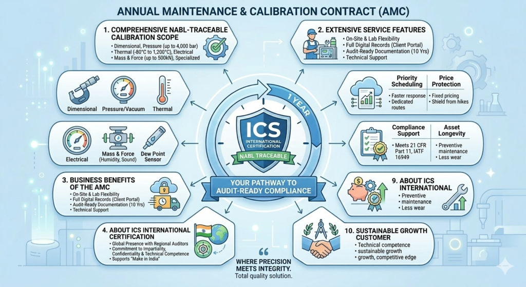 An Annual Calibration Contract (AMC) with ICS International Certification LLP ensures that your measuring instruments remain accurate, compliant, and reliable throughout the year. Our expert services are designed to support your quality systems and operational excellence.