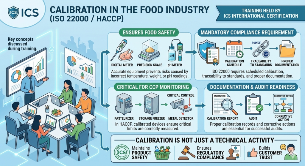 Calibration is a critical requirement in food manufacturing to ensure accurate measurement and safe food production. During the training session, key concepts related to calibration under ISO 22000 and HACCP were discussed.