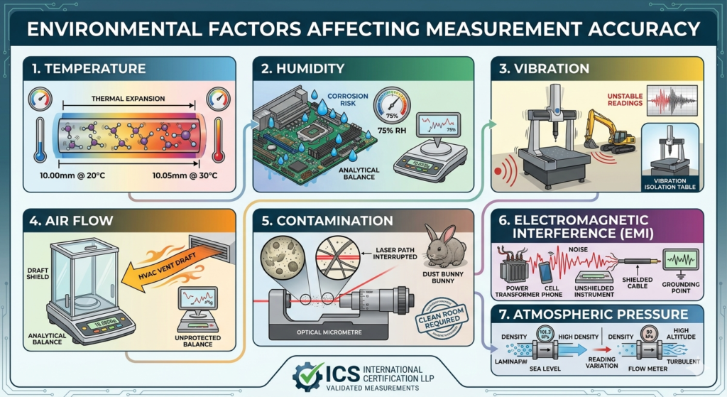 Environmental factors influence both the measuring equipment and the object being measured. Understanding and controlling these factors is essential for ensuring reliable, repeatable, and traceable measurement results.